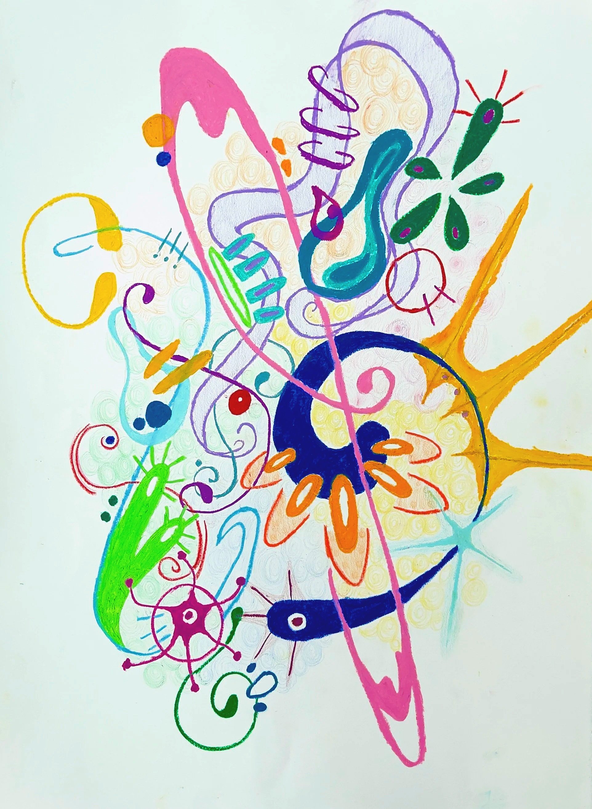 approaching this project, I wanted to experiment with texture work - i didn’t use a paintbrush in this work but instead used tools such as a palette knife, plastic wrap, the outside of a brick, bubble wrap, painter/ gaff tape, and a dish brush to achieve this look. the creatures showed up in my dreams and inspired how i thought about this piece. my largest scale painting to date!