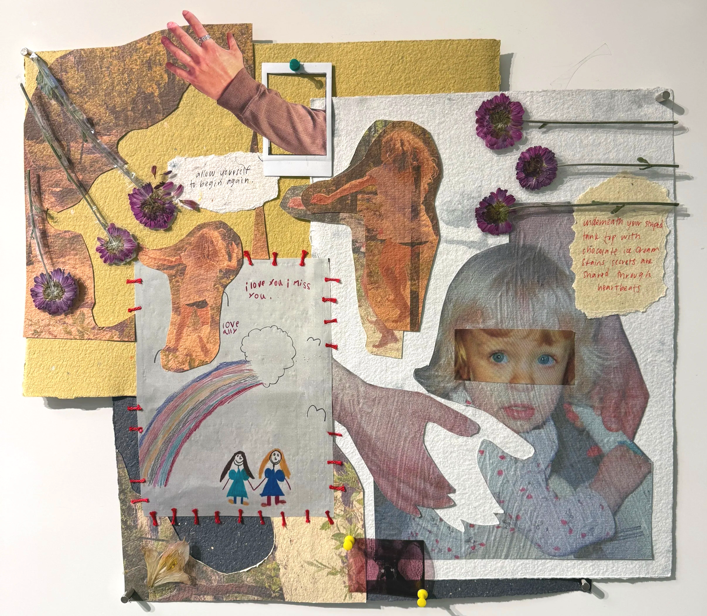 collage work printed on alternative handmade cotton paper and silk fabric, pressed tape flowers, and red yarn.