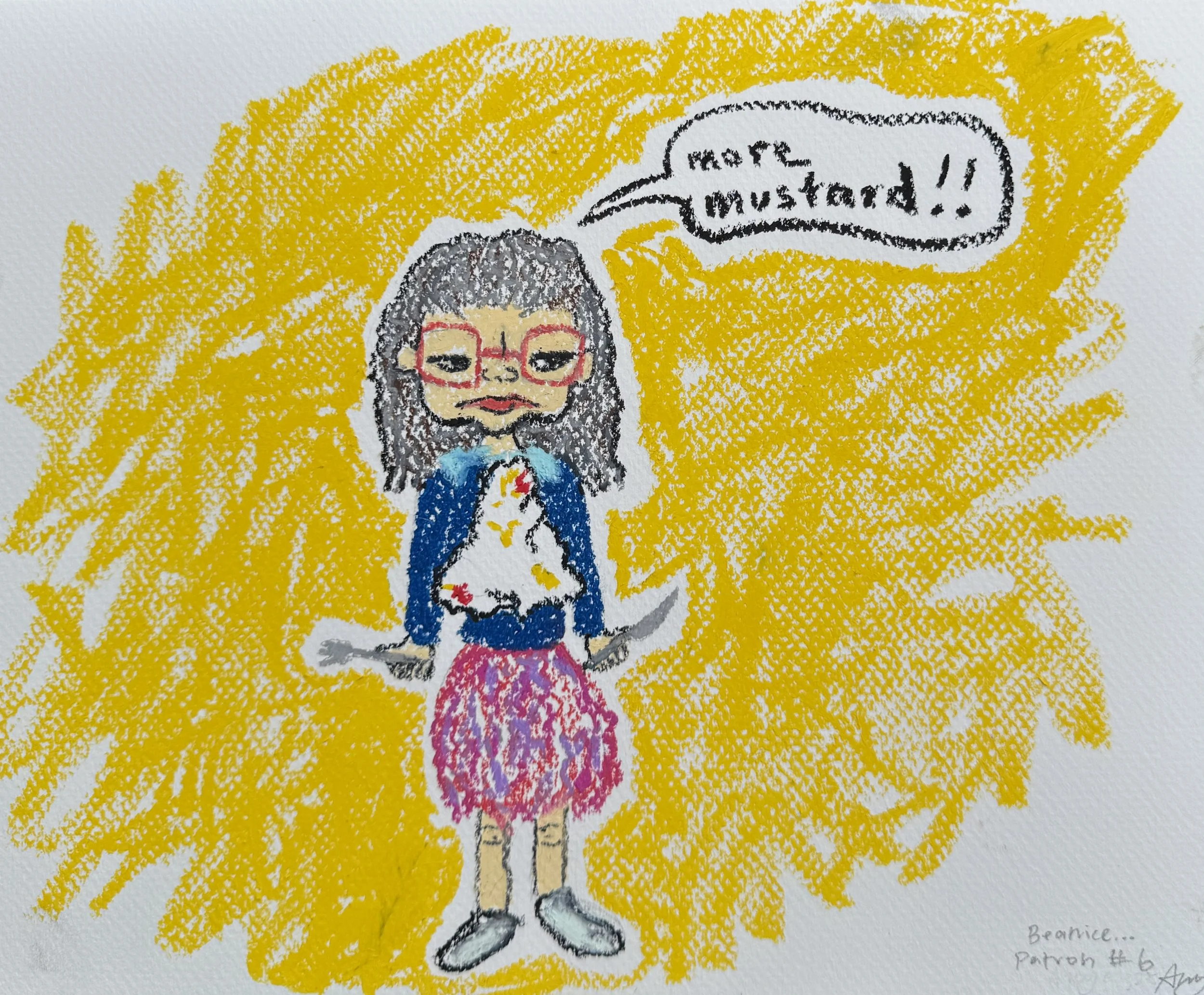 8×10 - oil pastel. i work as a server in the restaurant and something really compelled me to draw beatrice. she was quite an interesting woman… loved her mustard.
